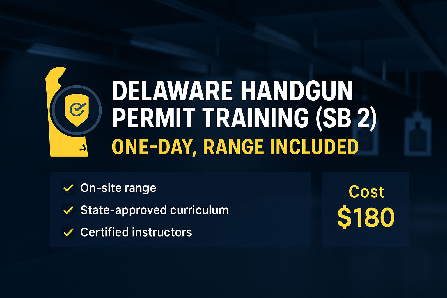 Delaware’s Handgun Qualified Purchaser Permit requires an approved course with live-fire on a range (minimum 100 rounds), plus instruction in safety, secure storage, Delaware and federal law including use of force, conflict avoidance, and suicide prevention. TSS delivers the full requirement under one roof in one day, taught by Delaware-approved and certified instructors. This course is designed to satisfy the training component for the permit taking effect in November 2025.